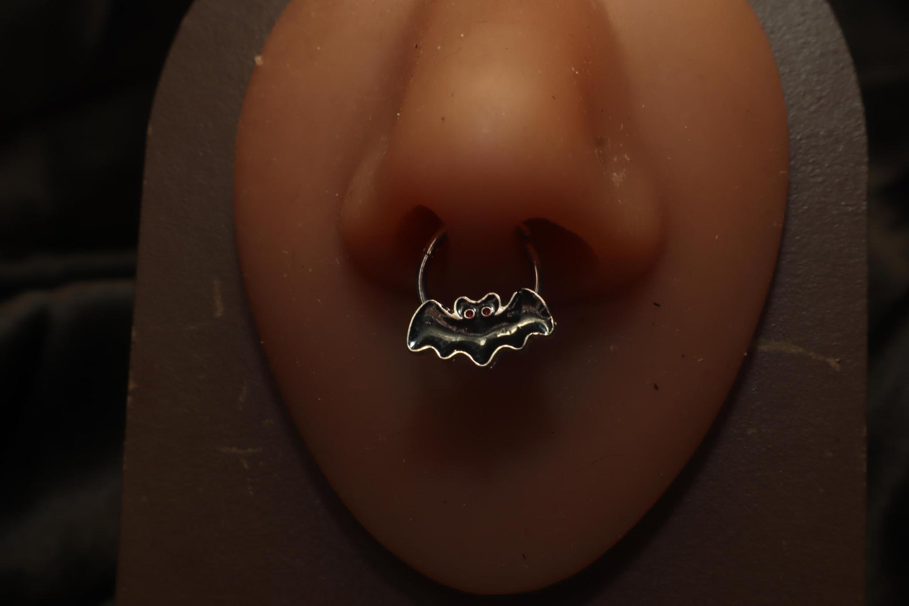 Daring Elegance: Elevate your Halloween style with the captivating allure of the Bat-tastic Septum Spider. Let its striking design and daring details take center stage in your Halloween look, captivating all with its dark and mystical appeal.